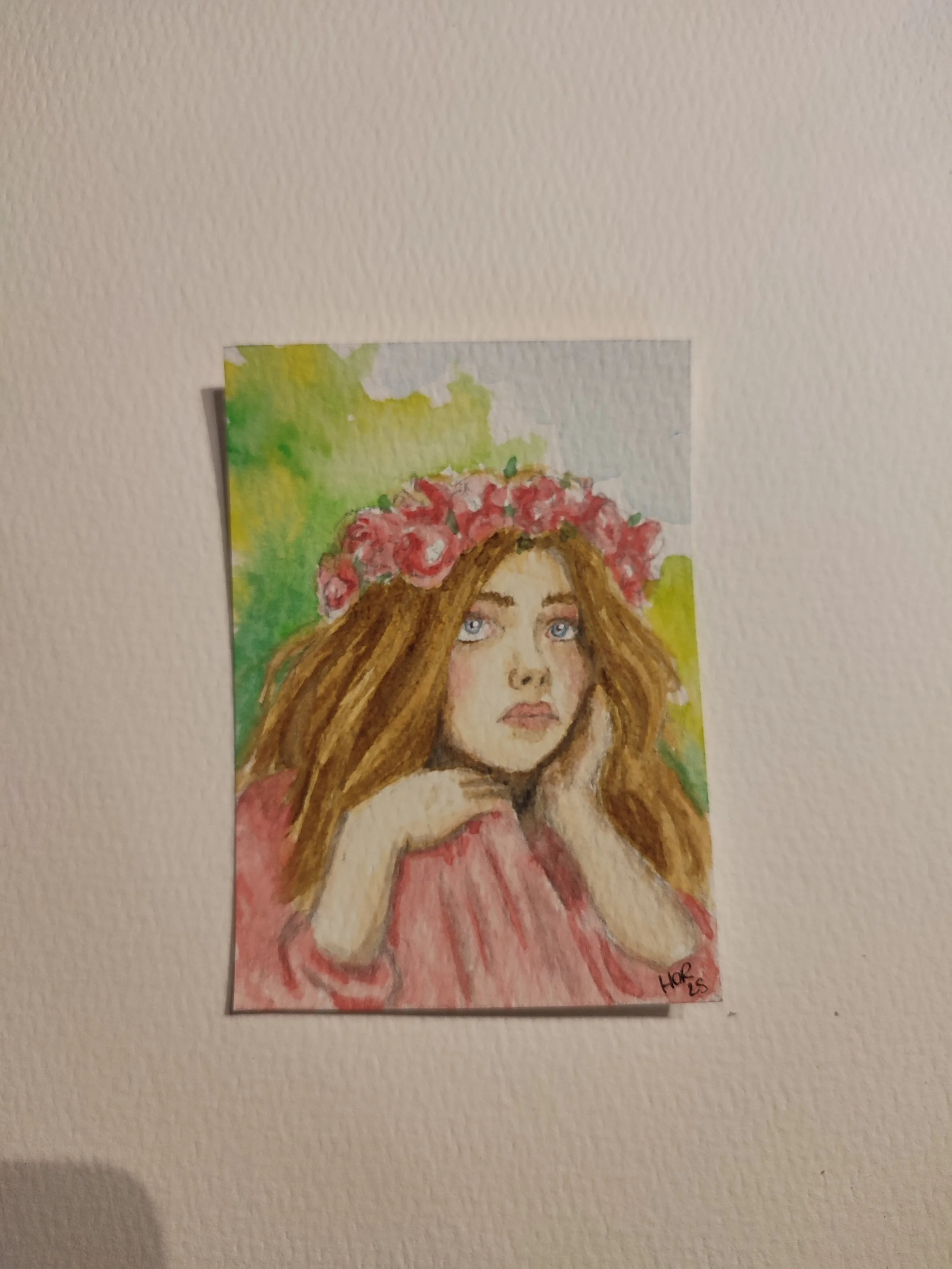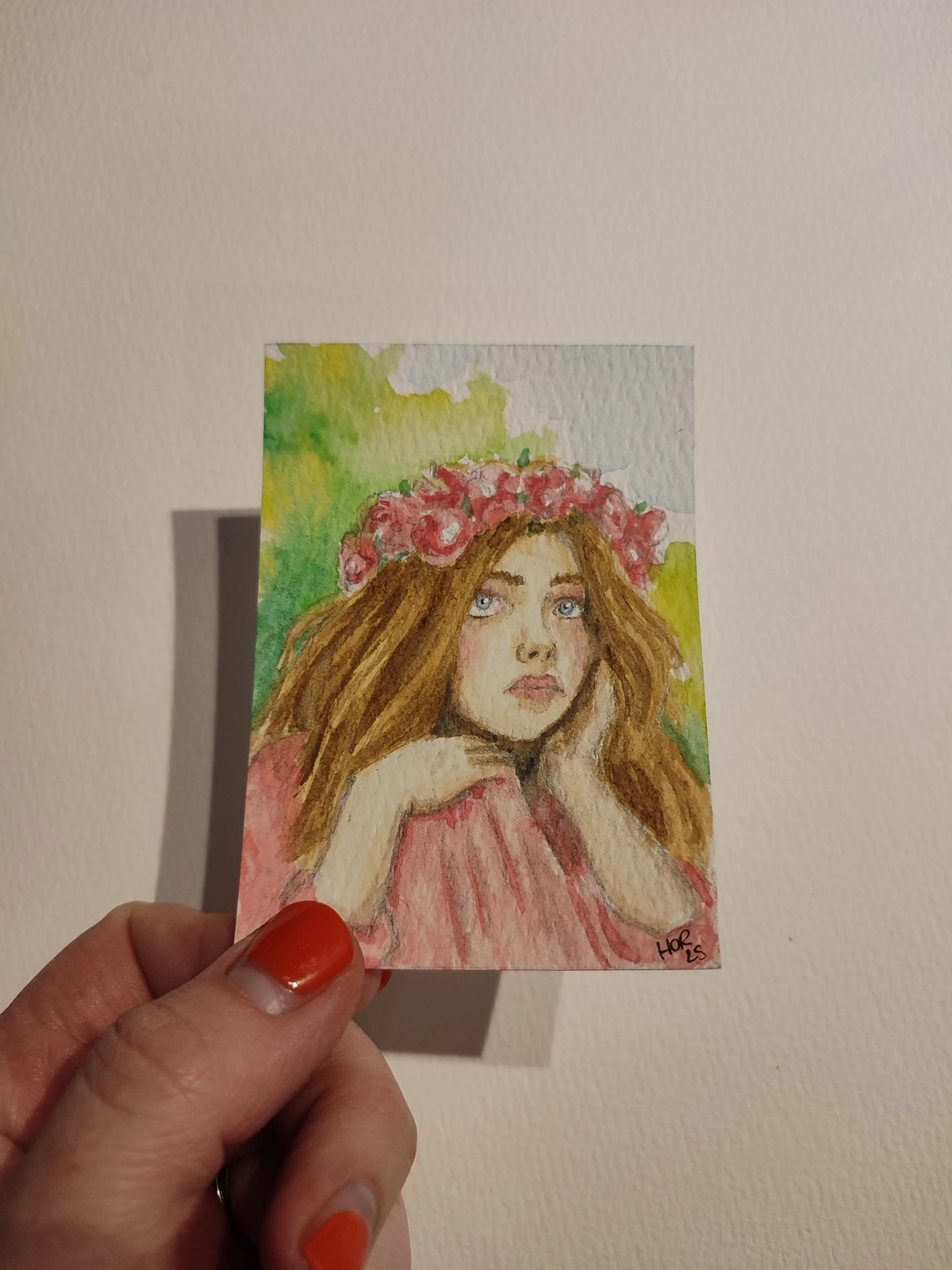 ACEO Original watercolour “wistful” featuring a portrait of a woman wearing a pink flower crown.