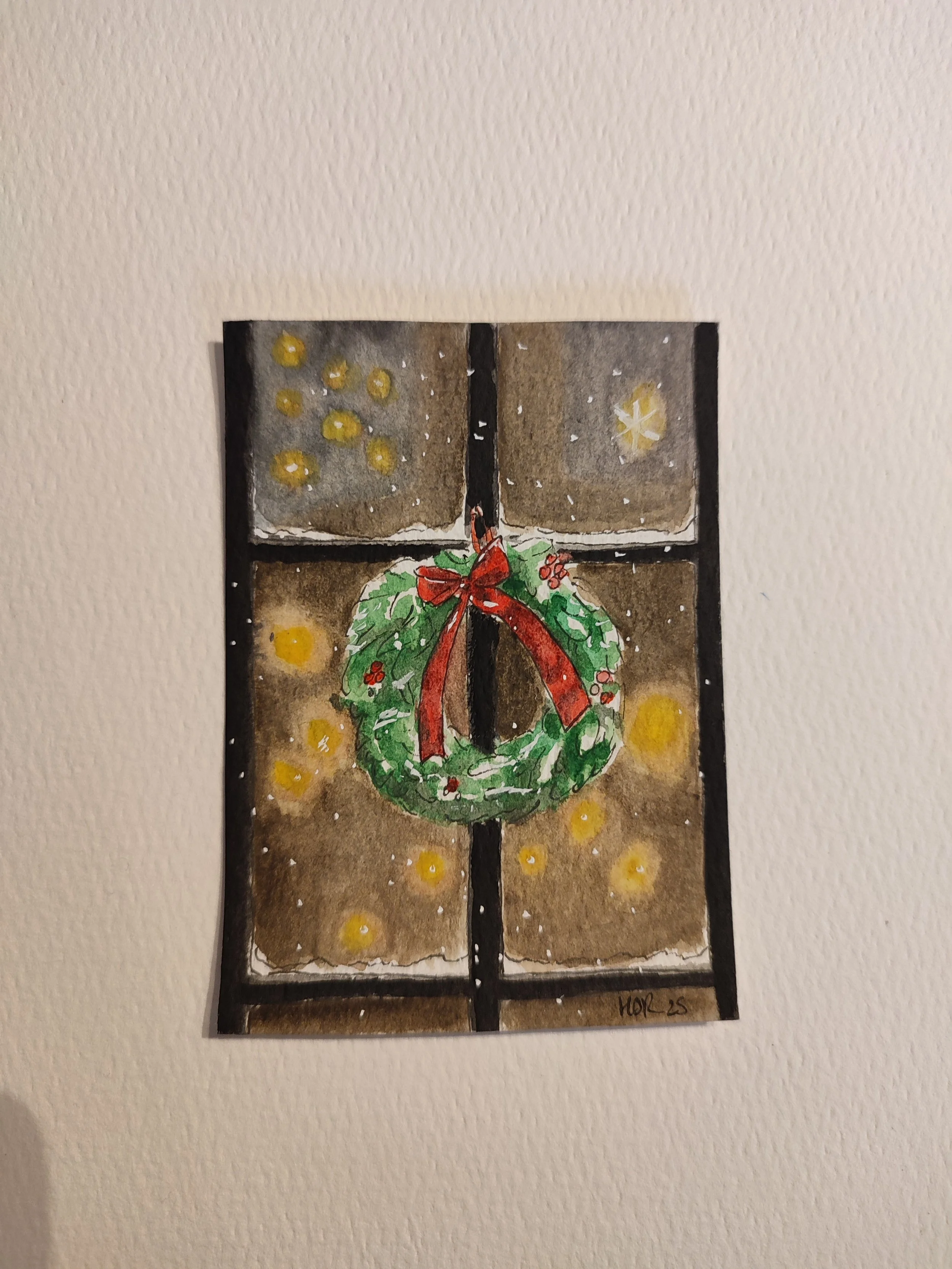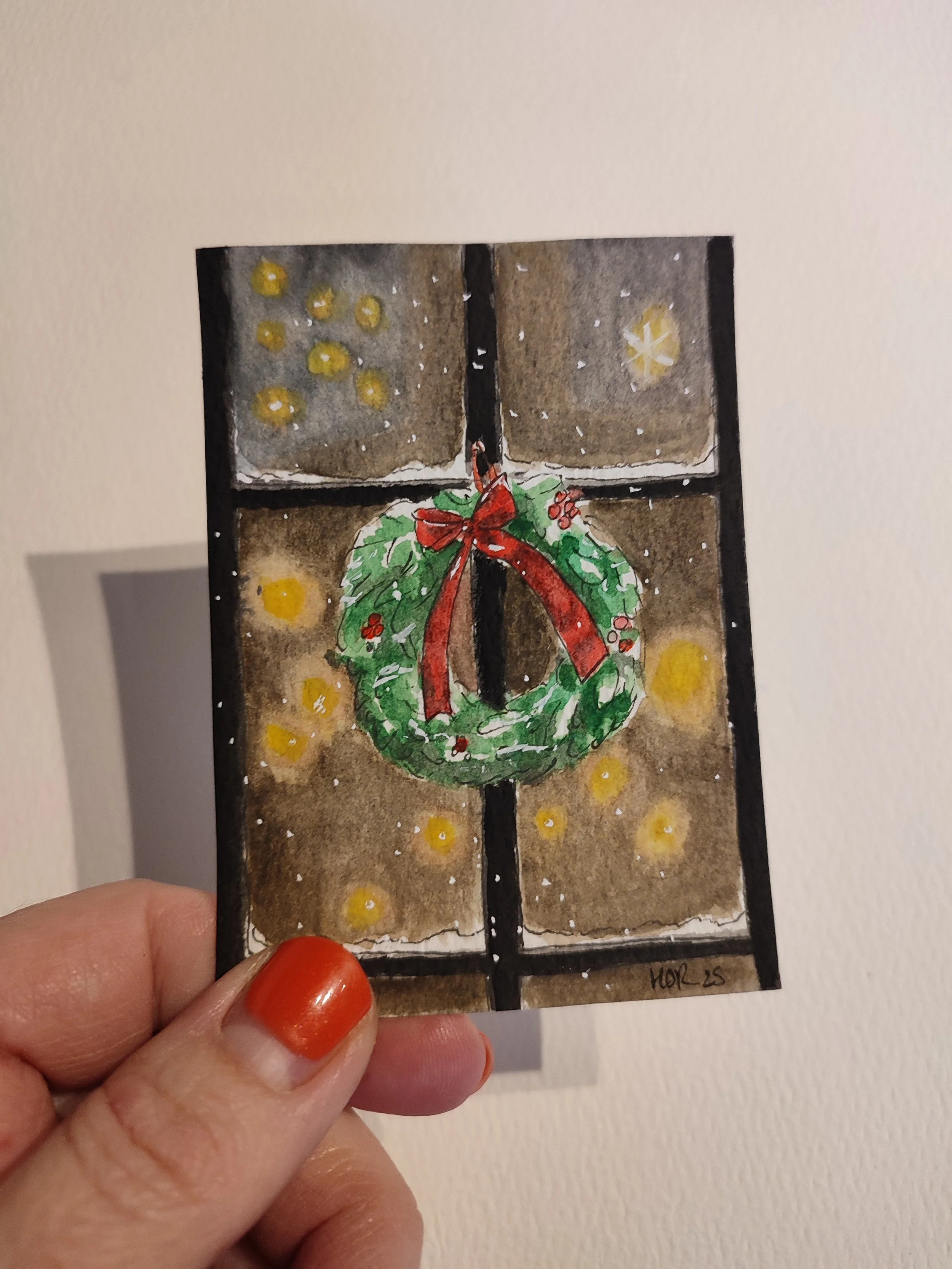 ACEO Original watercolour featuring a festive door with Christmas wreath.